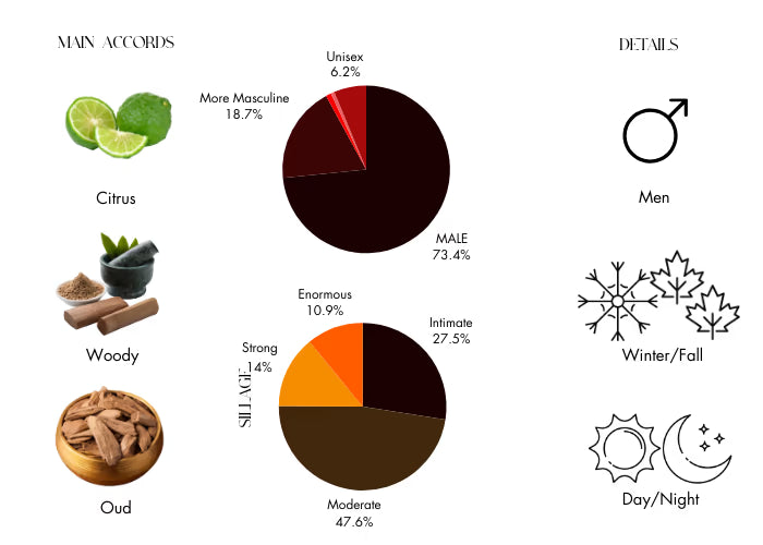 This new trendy fragrance has peppered mandarin, blue cypress, Calabrian bergamot, caraway, cardamom pods, marjoram, black leather, "Santal Fatal" accord (a mix of sandalwood, Atlas cedar and vetiver), agarwood, ebony wood, black moss absolute, and amber musk.